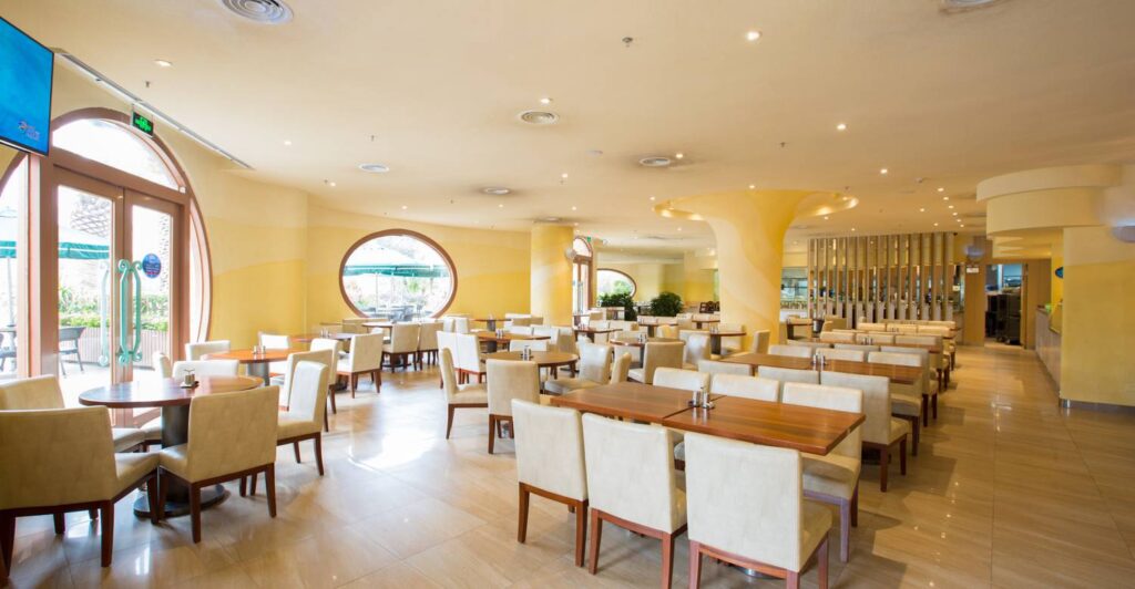 Step into a world where oceanic elegance meets modern comfort. The restaurant’s interior features sweeping views of the park’s iconic Whale Shark Exhibit, with floor-to-ceiling windows that frame the graceful dance of marine life. Nautical decor, shimmering aquatic motifs, and soft blue-and-silver color palettes evoke the serenity of the deep sea, while open kitchens allow guests to witness chefs crafting culinary masterpieces in real time.